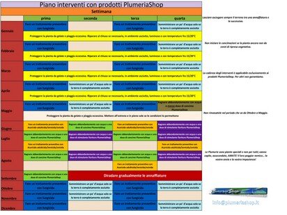 Durante la stagione vegetativa è utile seguire lo schema di concimazione e trattamenti regolari con concimi e stimolanti per plumerie fin dall’inizio stagione vegetativa come schematizzato nella nostra scheda liberamente scaricabile.